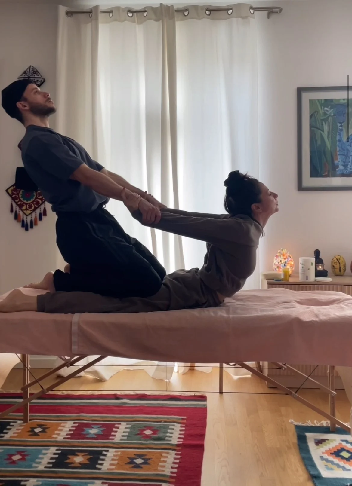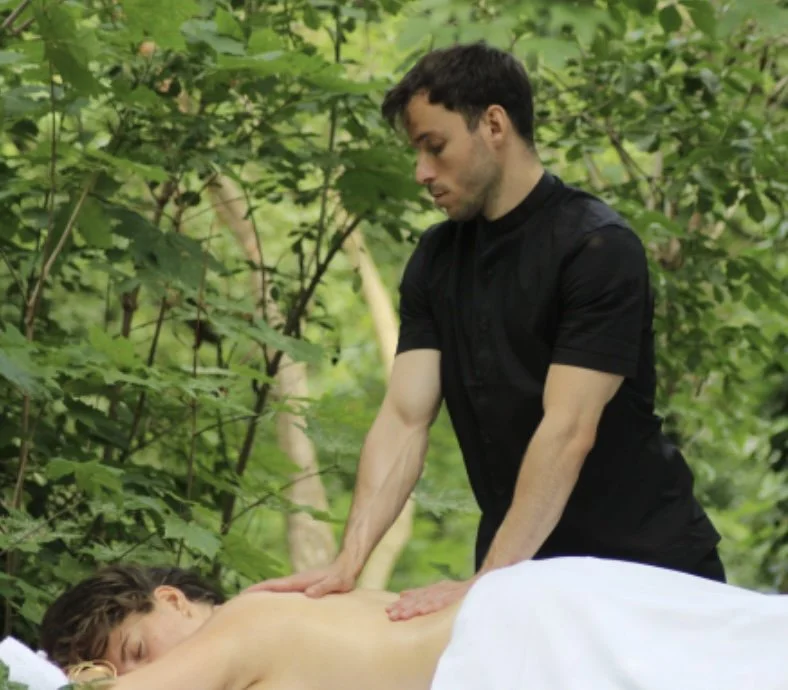Our sessions combine techniques like deep tissue, myofascial release, Thai massage, assisted stretching, and deep relaxation. Over time, we’ve refined this blend into our own unique method, always adapting to the needs of each person who comes to us.